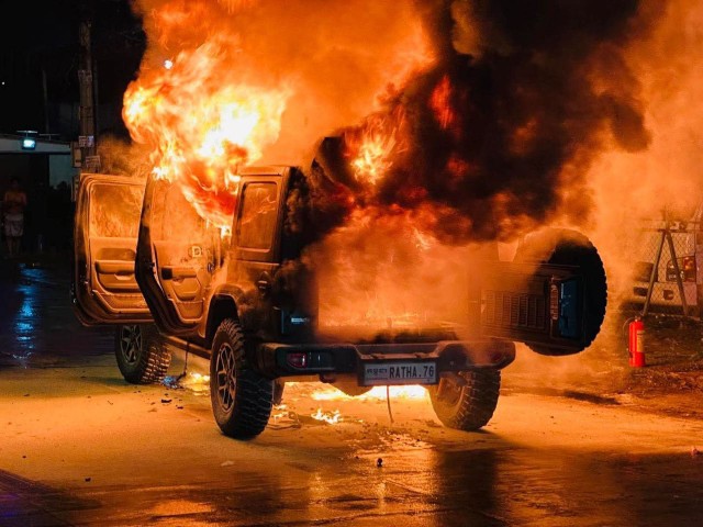 ដោយ : ភ្នំធំ / ភ្នំពេញ :រថយន្ដស៊េរីទំនើប Jeep ពាក់ផ្លាកលេខ កម្ពុជា RATHA.76 ត្រូវបានអគ្គិភ័យឆាបឆេះអស់ទាំងស្រុង បន្ទាប់ពីបេីកបុកជាមួយរថយន្ដ TOYOTA Prius ពាក់ផ្លាកលេខ ភ្នំពេញ 2VE-3962 រួចបន្តទៅបុកម៉ូតូ HONDA VARIO ពាក់ផ្លាកលេខ ភ្នំពេញ 1KM-7137 បណ្ដាលឲ្យរងការខូចខាត។