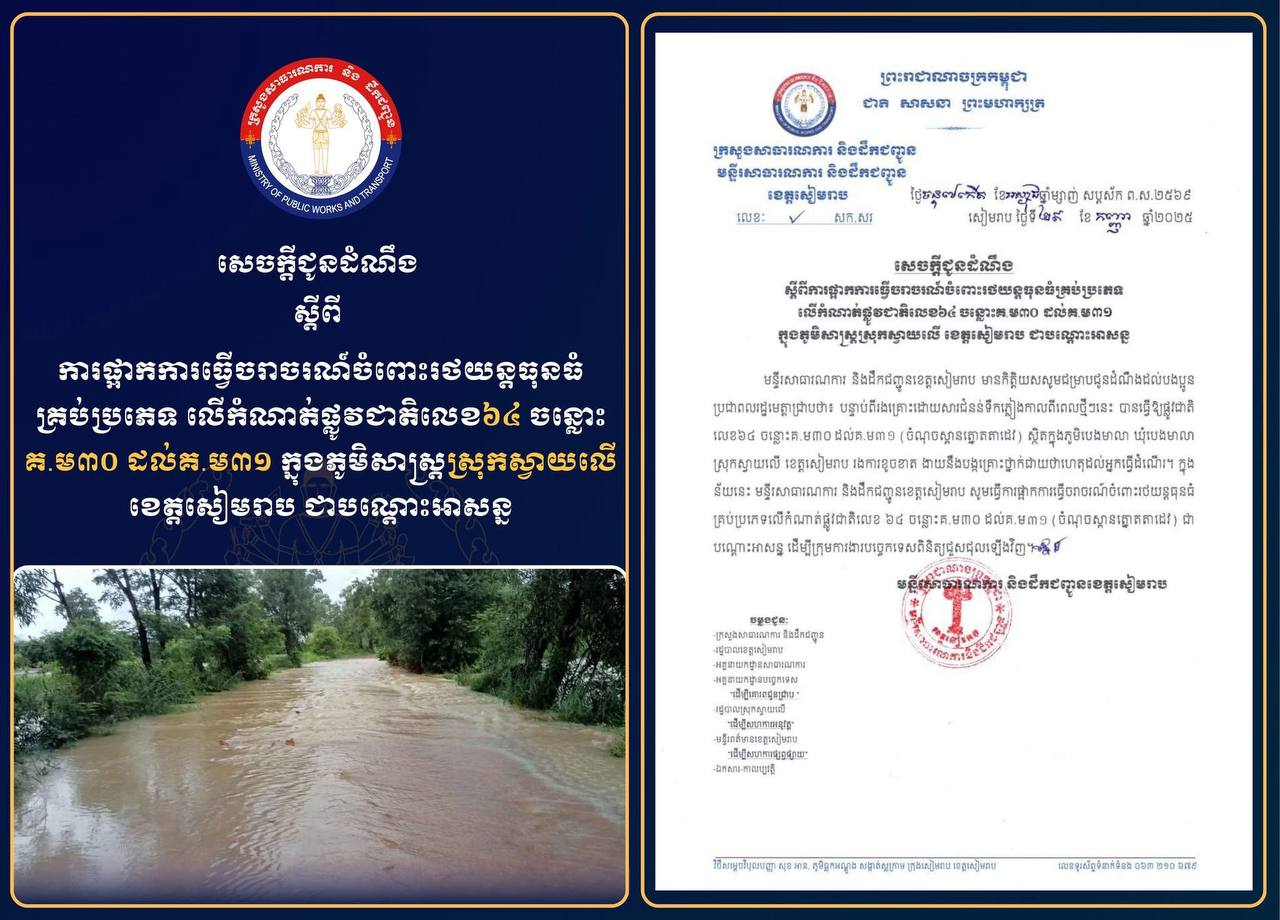 ដោយ : ភ្នំធំ / សៀមរាប :ក្រសួងសាធារណការនិងដឹកជញ្ជូនកាលពីថ្ងៃទី២៩ខែកញ្ញាឆ្នាំ២០២៥ បានសេចក្តីជូនដំណឹងស្តីពីការផ្អាកការធ្វើចរាចរណ៍ចំពោះរថយន្តធុនធំគ្រប់ប្រភេទលើកំណាត់ផ្លូវជាតិលេខ៦៤ ចន្លោះគ.ម៣០ ដល់គ.ម៣១ ក្នុងភូមិសាស្ត្រស្រុកស្វាយលើ ខេត្តសៀមរាប ជាបណ្តោះអាសន្ន ។