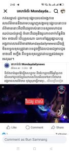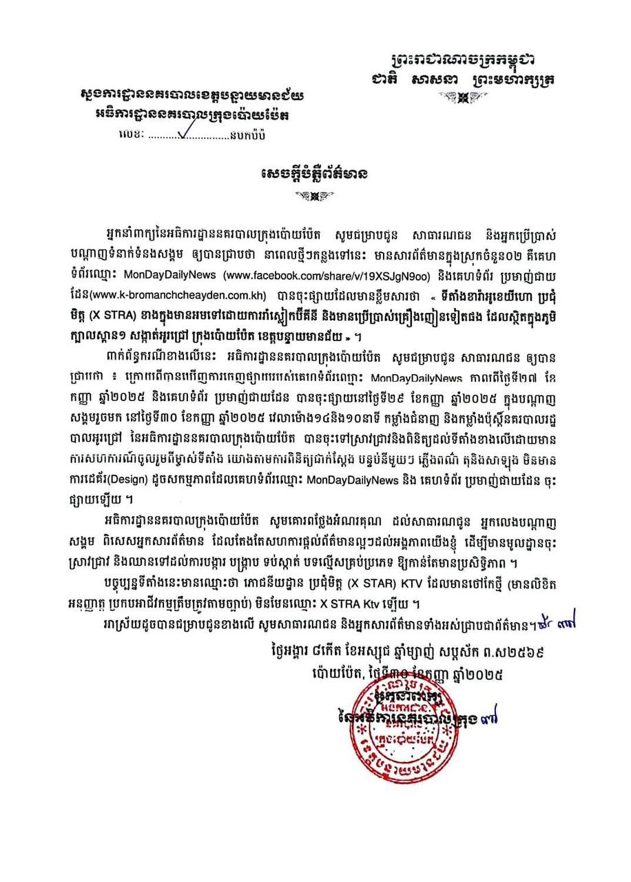បានចុះផ្សាយដែលមានខ្លឹមសារថា « ទីតាំងខារ៉ាអូខេយីហោ ប្រជុំមិត្ត (X STRA) ខាងក្នុងមានអមទៅដោយការរាំស្លៀកប៊ីគីនី និងមានប្រើប្រាស់គ្រឿងញៀនទៀតផង ដែលស្ថិតក្នុងភូមិក្បាលស្ពាន១ សង្កាត់អូរជ្រៅ ក្រុងប៉ោយប៉ែត ខេត្តបន្ទាយមានជ័យ » ។