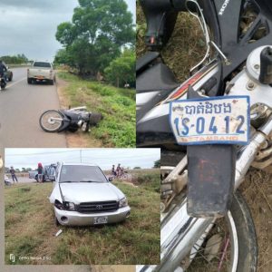 ដោយ : ភ្នំធំ / បាត់ដំបង :បុរសម្នាក់ស្លាប់បាត់បង់អាយុជីវិតភ្លាមៗ ក្នុងករណីគ្រោះថ្នាក់ចរាចរណ៍រវាងរថយន្ត Toyota Highlander ពណ៌ប្រាក់ ផ្លាកលេខ ភ្នំពេញ 2W-1773 ជាមួយនិងម៉ូតូ Honda Dream C125 ពណ៌ខ្មៅ ផ្លាកលេខ បាត់ដំបង 1S-0412 ។