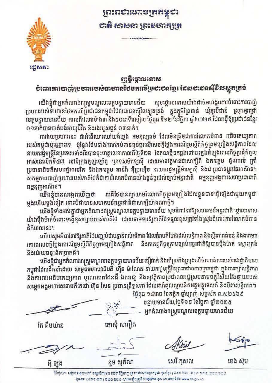 ដោយ : ភ្នំធំ / បន្ទាយមានជ័យ :តំណាងរាស្រ្តមណ្ឌលខេត្តបន្ទាយមានជ័យបានចេញញ្ញត្តិថ្កោលទោសចំពោះការចាប់រំលោភពលការិនីកម្ពុជាដោយកងទ័ពឈុតខ្មៅថៃពេលធ្វើដំណើរត្រឡប់មកព្រំដែន កម្ពុជា ថៃ កាលពីថ្ងៃទី១៥ ខែវិច្ឆិកា ឆ្នាំ២០២៥ ។