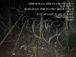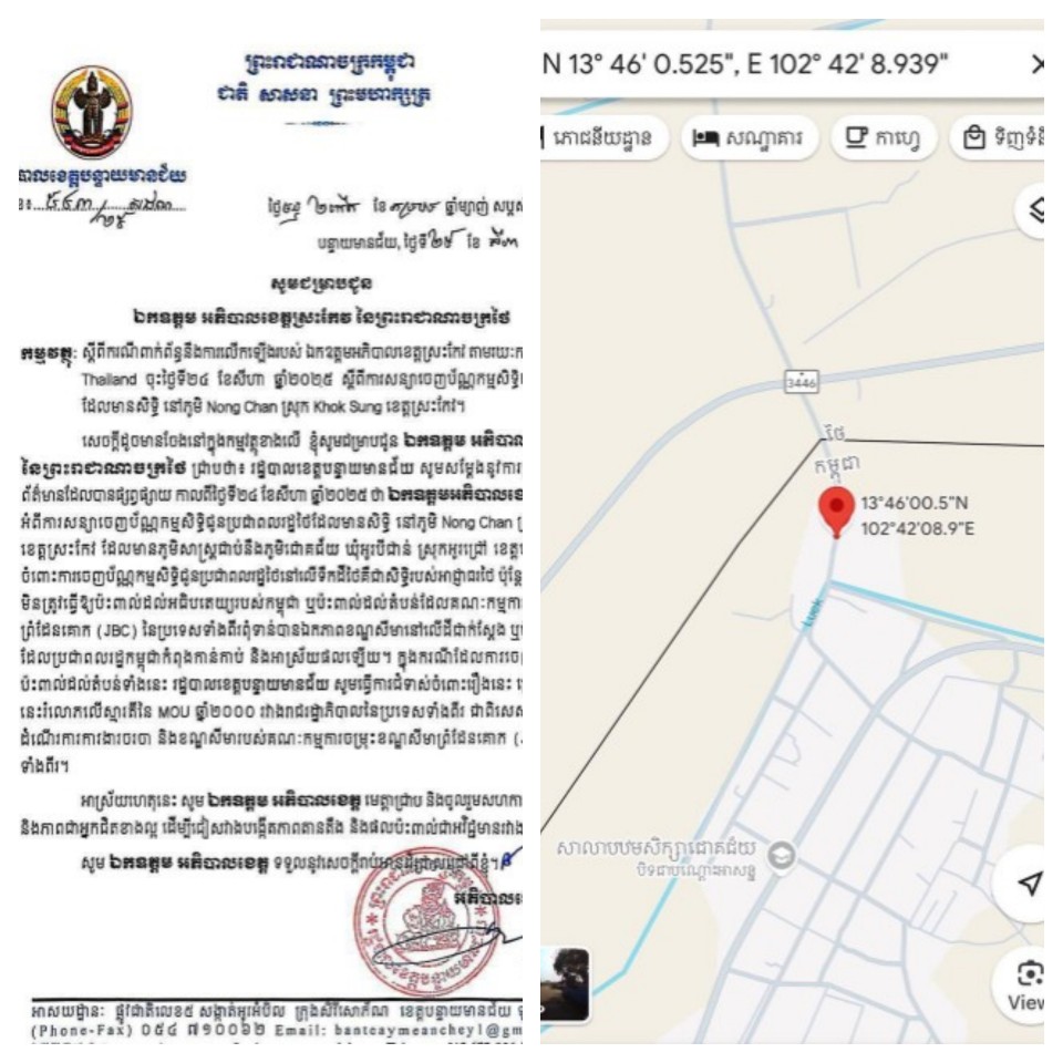 ដោយ : ភ្នំធំ / បន្ទាយមានជ័យ :រដ្ឋបាលខេត្តបន្ទាយមានជ័យកាលពីថ្ងៃទី២៥ខែសីហាឆ្នាំ២០២៥ បានចេញការតវ៉ាជំទាស់ដាច់អហង្ការចំពោះលោកអភិបាលខេត្តស្រះកែវ របស់ថៃអំពីរឿងដែលបានសន្យាចេញប័ណ្ណកម្មសិទ្ធិដីដល់ពលរដ្ឋថៃនៅភូមិណងចាន់ (Nong Chan) ឃុំ/ ស្រុកគោកស៊ូងឬគោកធ្យូង( Khok Sung) ខេត្តស្រះកែវ( SrakeavឬSakaeo) ដែលតាមពិតគឺជាទីកដីកម្ពុជា ភូមិជោគជ័យឃុំអូរបីជាន់ស្រុកអូរជ្រៅខេត្តបន្ទាយមានជ័យ( ចំណុចដែលទាហាសៀមពី៤០ទៅ៥០នាក់ បានលើកគ្នាមករាយបន្លាលួសរំលោភឈ្លានជពឆនចូលទឹកដីកម្ព្ជាកាលពីរសៀកថ្ងៃទី២៥ខែសីហាឆ្នាំ២០២៥) ។