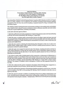 ទាក់ទិននឹងការរាយលួសបន្លា ការប្រើចំពាមបាញ់ ការដោះលែងទាហានកម្ពុជា១៨រូបដែលទាហានថៃប្រើល្បិចព័ទ្ធចាប់ពង្រត់កាលពីថ្ងៃទី២៩ខែកក្កដានៅជាំតែ…អីៗ ពុំឃើញបានលើកឡើងក្នុងលទ្ធផលខ្លឹមសារស្មារតីនៃកិច្ចប្រជុំនេះឡើយ ។