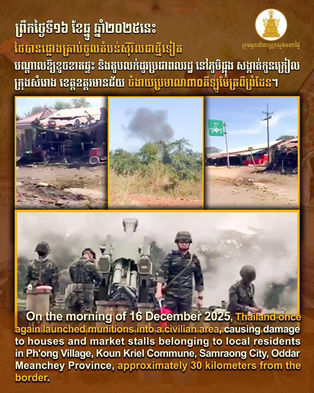 ដោយ : ភ្នំធំ / ឧត្តរមានជ័យ :ថ្ងៃទី១៦ ខែធ្នូ ឆ្នាំ២០២៥នេះ យោធាថៃបានផ្លោងគ្រាប់ចូលតំបន់សុីវិលជាថ្មីទៀត បណ្ដាលឱ្យខូចខាតផ្ទះ និងតូបលក់ដូរ ប្រជាពលរដ្ឋ នៅភូមិផ្អុង សង្កាត់កូនក្រៀល ក្រុងសំរោង ខេត្តឧត្តរមានជ័យ ។