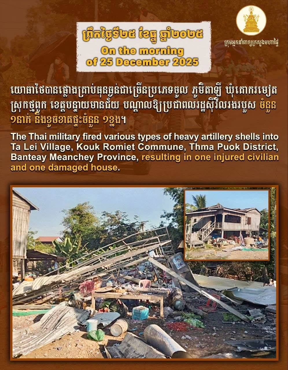 the Thai military fired various types of heavy artillery shells into Ta Lei Village, Kouk Romiet Commune, Thma Puok District, Banteay Meanchey Province, resulting in one injured civilian and one damaged house.