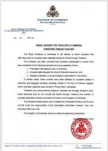 ដើម្បីទប់ស្កាត់អំពើបំភិតបំភ័យ និងទង្វើមិនសមរម្យរបស់អាជ្ញាធរថៃនេះ ក្រសួងសូមធ្វើការណែនាំ ស្ថានតំណាងកម្ពុជាប្រចាំនៅបរទេស ជូនដំណឹងដល់អ្នកដំណើរទាំងខ្មែរ និងបរទេសឱ្យចៀសវាងធ្វើ ដំណើរឆ្លងកាត់ប្រទេសថៃ និងផ្អាកប្រើប្រាស់សេវារបស់ក្រុមហ៊ុនអាកាសចរណ៍ថៃជាបណ្តោះអាសន្ន រហូតដល់មានការជូនដំណឹងជាថ្មី៕