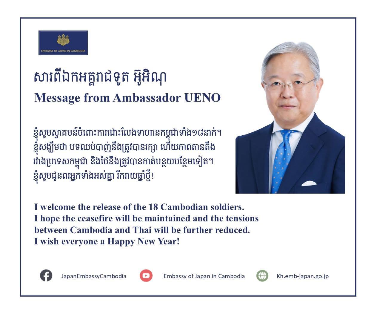 ដោយ : ភ្នំធំ / ភ្នំពេញ:លោកអ៊ូអ៊ីណូ អាត់ស៊ូសហស៊ី ( UENO Atsushi ) ឯកអគ្គរាជទូតជប៉ុនប្រចាំកម្ពុជាថ្លែងកាលពីថ្ងៃទី៣១ខែធ្នូឆ្នាំ២០២៥ ថា: ” ខ្ញុំសូមស្វាគមន៍ចំពោះការដោះលែងទាហានកម្ពុជាទាំង១៨នាក់។ ខ្ញុំសង្ឃឹមថា បទឈប់បាញ់នឹងត្រូវបានរក្សា ហើយភាពតានតឹងរវាងប្រទេសកម្ពុជា និងថៃនឹងត្រូវបានកាត់បន្ថយបន្ឲឱឲថែឲមទៀត ” ។