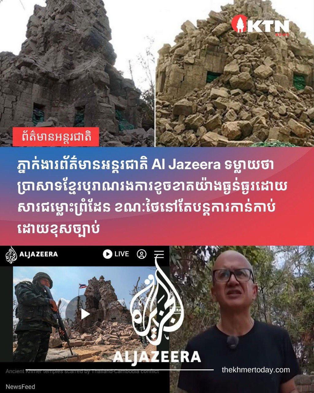 ដោយ : ភ្នំធំ / ភ្នំពេញ :ភ្នាក់ងារព័ត៌មាន Al Jazeera បានទម្លាយឱ្យដឹងចំៗថា “ប្រាសាទខ្មែរបុរាណនៅតាមបណ្តោយព្រំដែនកម្ពុជា-ថៃ បានរងការខូចខាតដោយសារការប្រយុទ្ធគ្នាជុំវិញជម្លោះទាមទារអធិបតេយ្យភាពដែនដីដ៏រ៉ាំរ៉ៃ នៅក្នុងតំបន់ដែលមានវត្តមានយោធាយ៉ាងច្រើន និងភាគច្រើនត្រូវបានហាមឃាត់មិនឱ្យចូល” ។