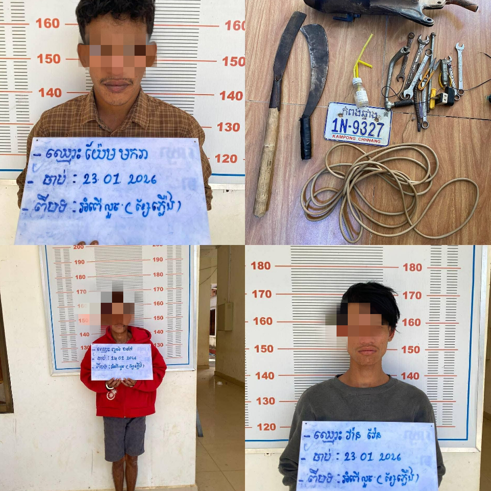 (កំពង់ឆ្នាំង)៖ កម្លាំងសមត្ថកិច្ចនៃអធិការដ្ឋាននគរបាលស្រុកសាមគ្គីមានជ័យ បានធ្វើការស្រាវជ្រាវរហូតឈានដល់ការឃាត់ខ្លួនជនសង្ស័យចំនួន ៣នាក់ ជាបន្តបន្ទាប់ ពាក់ព័ន្ធនឹងករណីលួចកាត់ខ្សែភ្លើងរបស់អ្នកភូមិ កាលពីថ្ងៃទី២៤ ខែមករា ឆ្នាំ២០២៦។