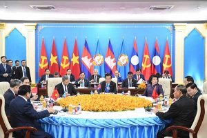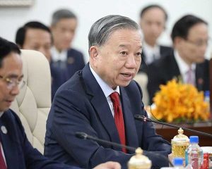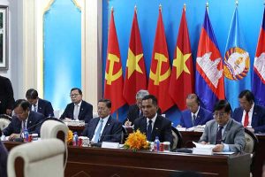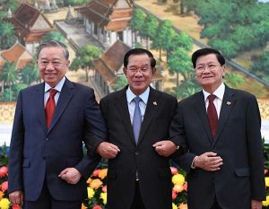 ភ្នំពេញ ថ្ងៃទី០៦ ខែកុម្ភៈ ឆ្នាំ២០២៦ សម្តេចអគ្គមហាសេនាបតីតេជោ ហ៊ុន សែន ប្រធានគណបក្សប្រជាជនកម្ពុជា និងជាប្រធានព្រឹទ្ធសភានៃព្រះរាជាណាចក្រកម្ពុជា ឯកឧត្តម តូ ឡឹម ( TO Lam ) អគ្គលេខាធិការបក្សកុម្មុយនីស្តវៀតណាម និងឯកឧត្តមបណ្ឌិត ថងលុន ស៊ីសុលីត អគ្គលេខាធិការបក្សប្រជាជនបដិវត្តន៍ឡាវ និងជាប្រធានរដ្ឋ នៃសាធារណរដ្ឋប្រជាធិបតេយ្យប្រជាមានិតឡាវ អញ្ជើញដឹកនាំកិច្ចប្រជុំកំពូលត្រីភាគី នៅវិមាន៧មករា រាជធានីភ្នំពេញ នារសៀលថ្ងៃទី០៦ ខែកុម្ភៈ ឆ្នាំ២០២៦ ដោយកិច្ចប្រជុំកំពូលនេះក៏មានការអញ្ជើញចូលរួមពីនាយករដ្ឋមន្រ្តីនៃប្រទេសទាំងបី ថ្នាក់ដឹកនាំសភានៃប្រទេសទាំងបី និងឥស្សរជននៃគណបក្សទាំងបីមួយចំនួនទៀត។(AKP)