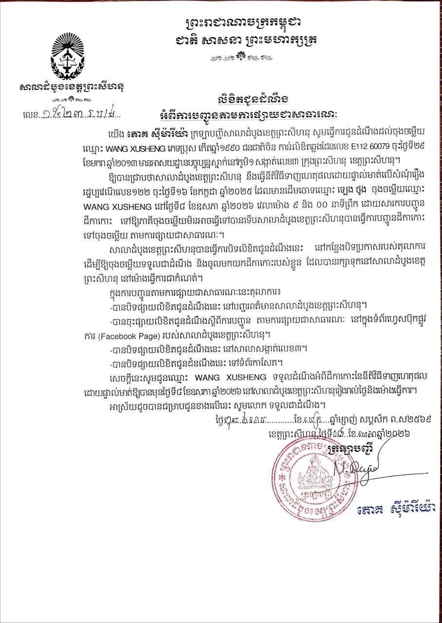 Caption:លិខិតជូនដំណឹងអំពីការបញ្ជូនតាមការផ្សាយជាសាធារណៈរបស់សាលាដំបូងខេត្តព្រះសីហនុ