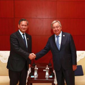សម្តេចធិបតីហ៊ុន ម៉ាណែត នាយករដ្ឋមន្ត្រីកម្ពុជាបានអញ្ជើញជួបសម្តែងការគួរសមនិងពិភាក្សាការងារជាមួយ ឯកឧត្តមអង់តូនីញ៉ូ ហ្គូទែរ៉េស (António Guterres ) អគ្គលេខាធិការអង្គការសហប្រជាជាតិ។