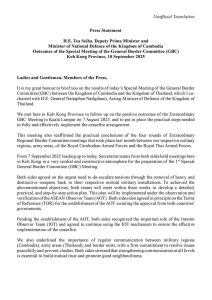 ដោយ : ភ្នំធំ / កោះកុង :សេចក្តីប្រកាសព័ត៌មានរបស់អ្នកនាំពាក្យក្រសួងការពារជាតិកម្ពុជា៖សូមជម្រាបជូនដល់សាធារណជន អ្នកសារព័ត៌មានជាតិ និងអន្តរជាតិ អំពីលទ្ធផលនៃកិច្ចប្រជុំ ពិសេសលើកទី១ របស់គណៈកម្មាធិការព្រំដែនទូទៅកម្ពុជា-ថៃ (GBC) ដែលបានប្រព្រឹត្តទៅនាព្រឹកនេះ ហើយបានបញ្ចប់ទៅនៅវេលាម៉ោង ១១:១៥នាទី នៅក្រុងខេមរភូមិន្ទ ខេត្តកោះកុង ព្រះរាជាណាចក្រកម្ពុជា ដែលដឹកនាំដោយលោកនាយឧត្តមសេនីយ៍ ទៀ សីហា ឧបនាយករដ្ឋមន្រ្តី រដ្ឋមន្រ្តីក្រសួងការពារជាតិ នៃព្រះរាជាណាចក្រកម្ពុជា និងលោកណាត់ថាក់ផុន ណាកផានីត រដ្ឋមន្រ្តីស្តីទីក្រសួងការពារជាតិ នៃព្រះរាជាណាចក្រថៃ។